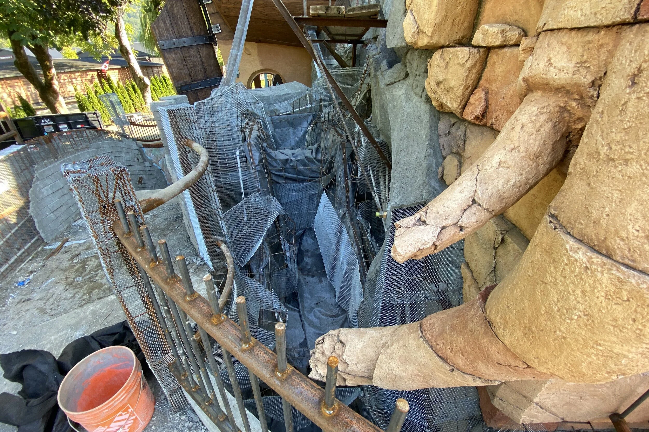 The rubber liner for the North Star suite’s waterfalls is tucked and secured in place — that means we can finish off the concrete in this area. It won’t be long until we hear the sound of tumbling water!