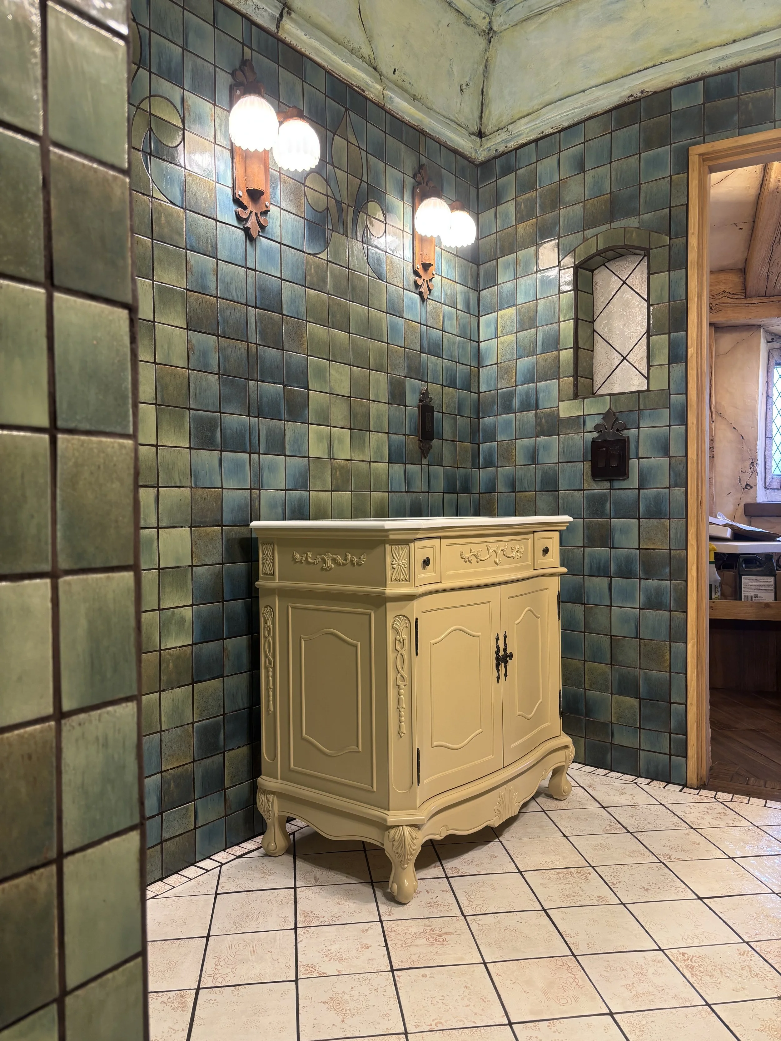 Today we are one step closer to finishing the Copper Crown Suite as we sealed the ensuite tile and grout. Once it was dry we couldn’t resist moving the vanity in for a test fit — stay tuned for more!