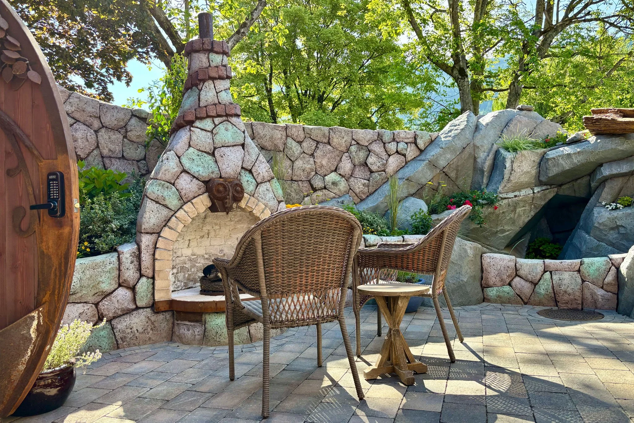 Beyond its heavy gate lies a walled garden, a private patch of the world where time itself seems to slow its pace. Here, the gentle music of a waterfall mingles with the crackle of an outdoor fireplace, perfect for contemplating the stars without a whisper of the outside world to interrupt your tranquility.