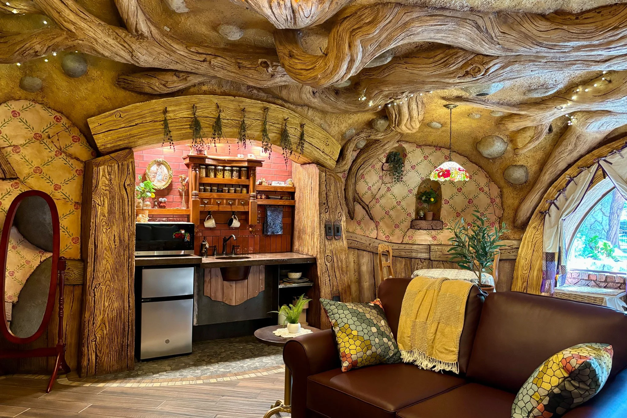 Inside, the suite is full of earthy comfort — the ceiling itself seems to grow from the very soil above. There are no sharp corners or stumbly stairs here; it is a refuge of peace, boasting a sumptuous king-size bed tucked into its own snug corner. And for the weary bones of a tired wonderer, there is a deep soaker tub, inviting you to sink into its steamy water. While for the hungry traveler, a thoughtful kitchenette stands ready, stocked with the sorts of scrumptious snacks and fizzy beverages.