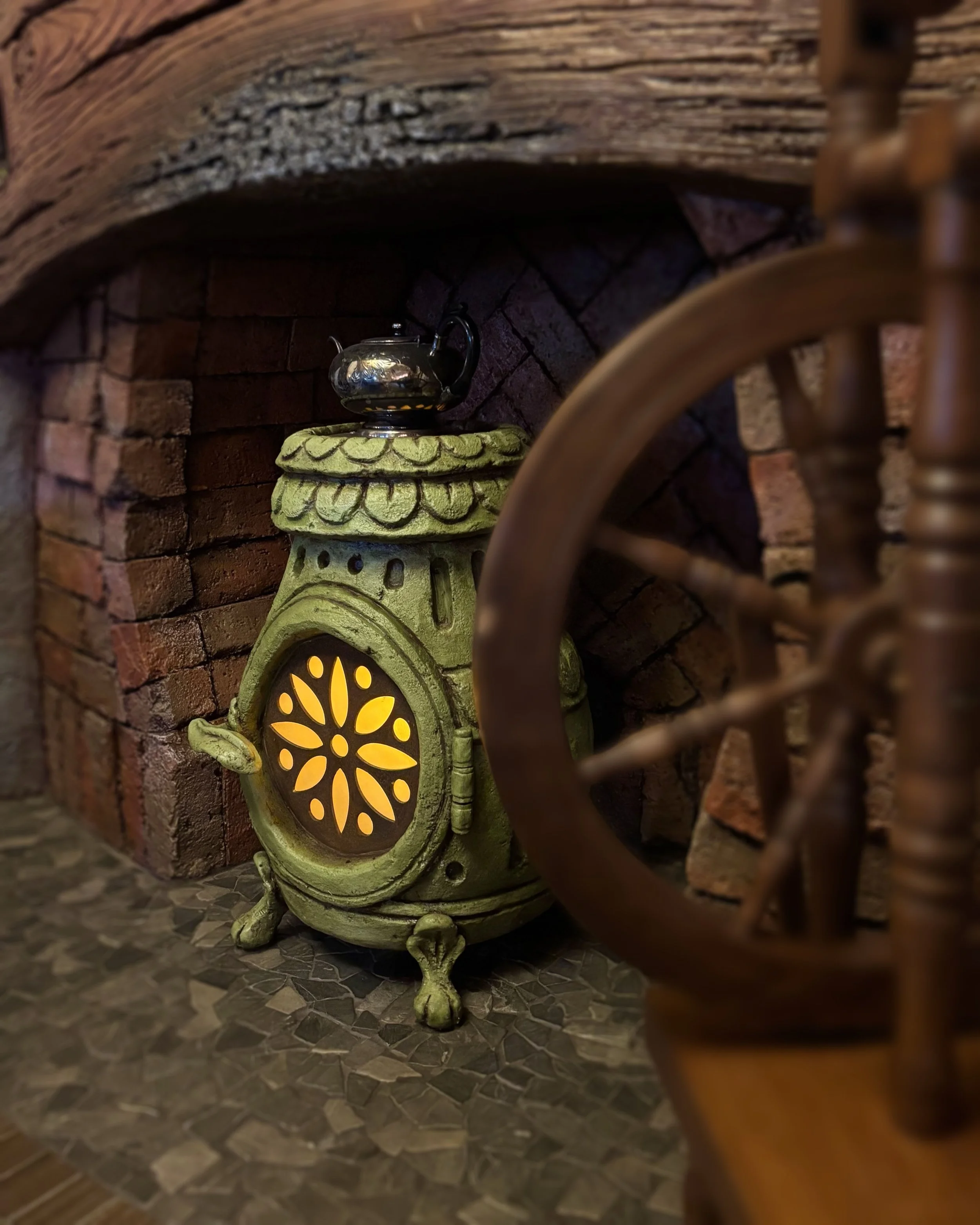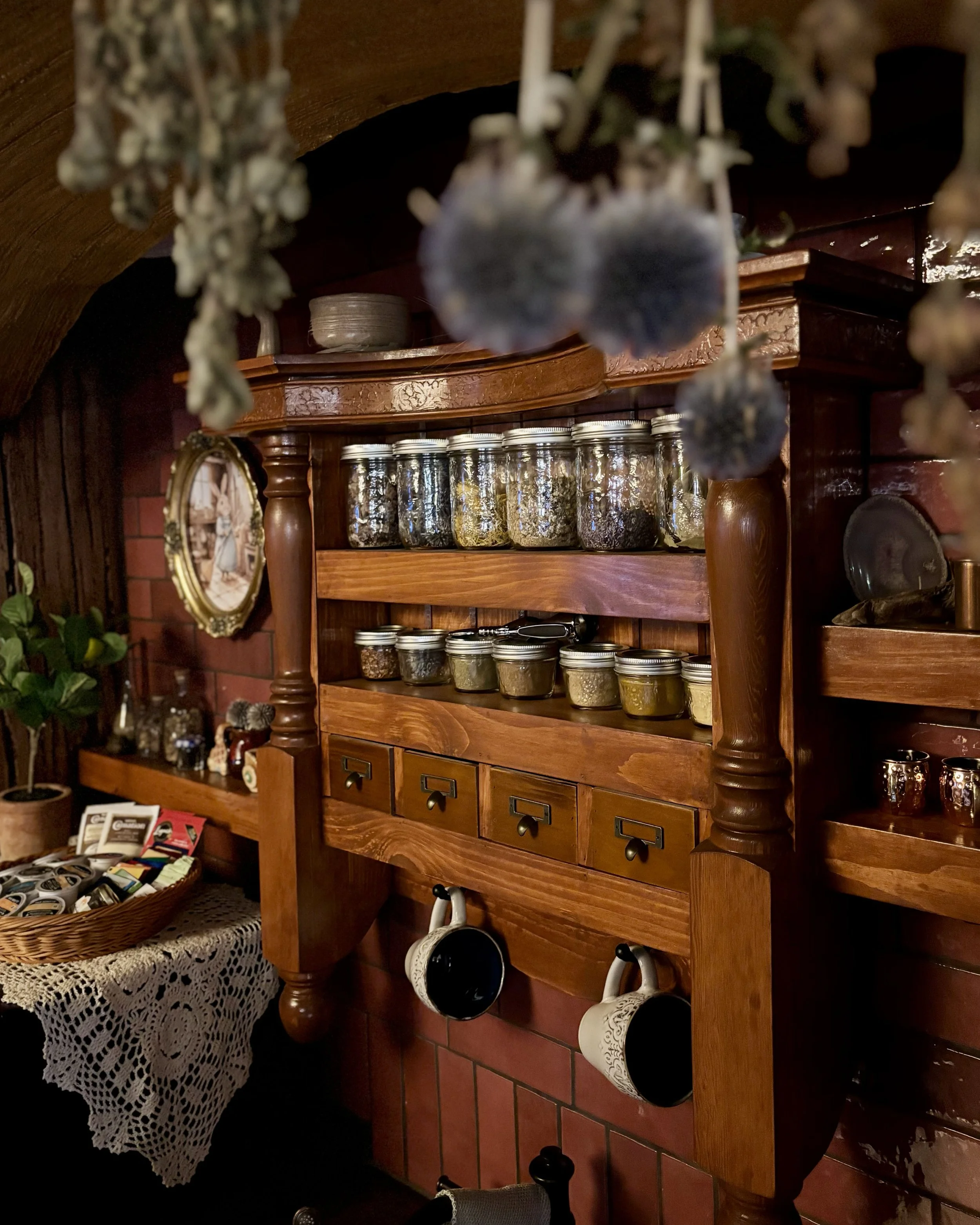 The kitchen reflects a similar ancestral care, thanks to Mr. Burrows’ thrice-great-grandmother. A woman whispered to be capable of brewing a change in the wind, she added a little scullery and filled it with all manner of treats and fizzy drinks. Upon the shelves, she placed jars of spices—their glass bellies full of spices of amber and deep green — so that the air remains perpetually seasoned with the faint, comforting scent of cardamom and thyme.