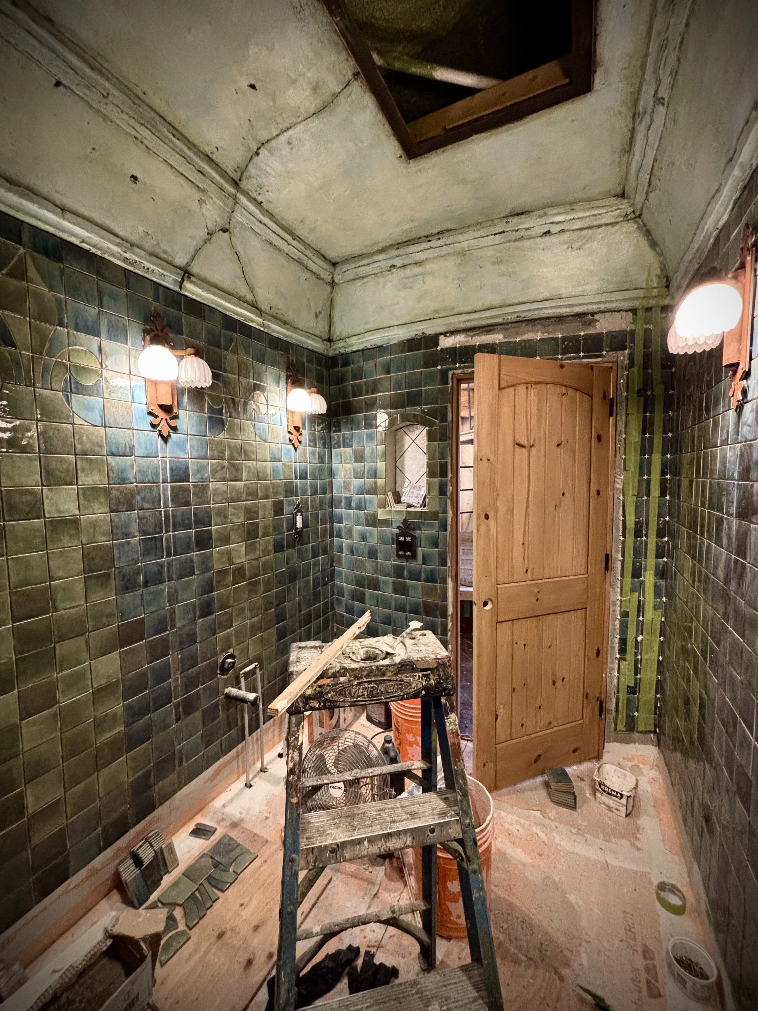 The tile work inside the Copper Crown Suite is coming along beautifully. The ensuite walls are nearing completion and the bedroom floor is ready for grout. By the end of the week we will be moving down the stairs and into the rest of the suite. Stay tuned…